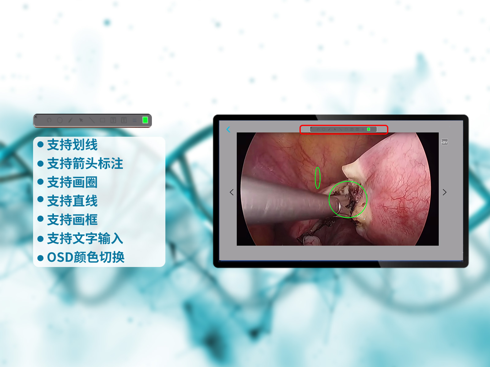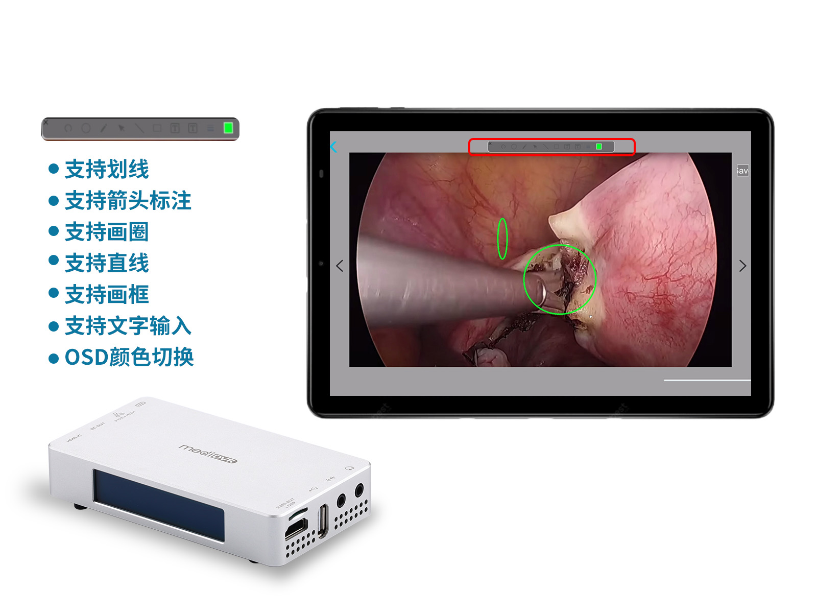 MediDVR, MD3提供劃線、箭頭標注、畫圈、直線、畫框、文字輸入等多種標注選項。此外,還可輕松切換OSD顏色,滿足不同需求。