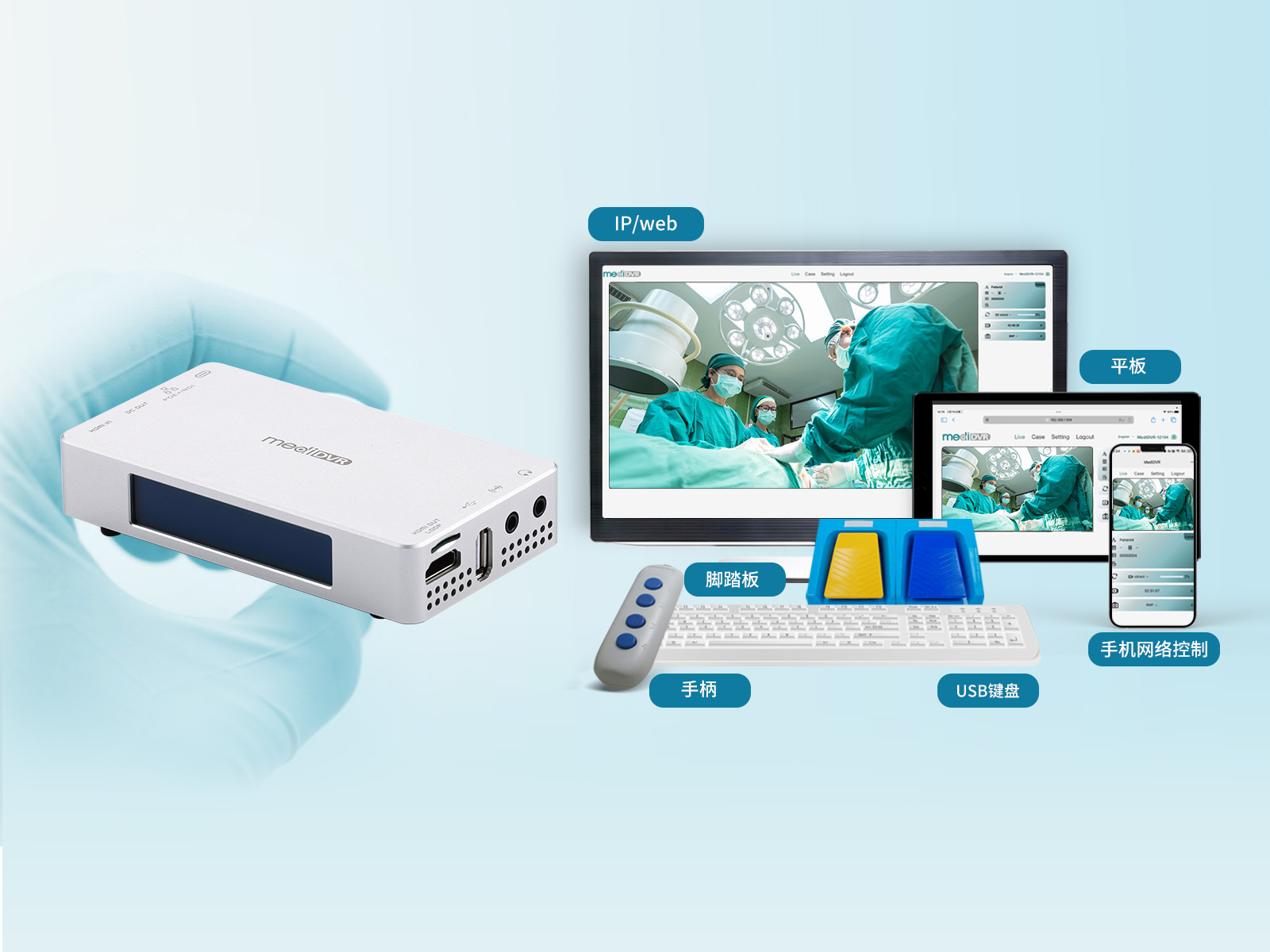 您可以通過手機、平板和電腦輕松訪問MediDVR, MD3 的mDNS地址控制它。可快速訪問您的外科手術(shù)病例,以便查閱、批注、播放和下載。同時還提供外科手術(shù)報告、遠程控制拍照和視頻功能。此外,腳踏板和手柄也可以進行拍照錄像的控制