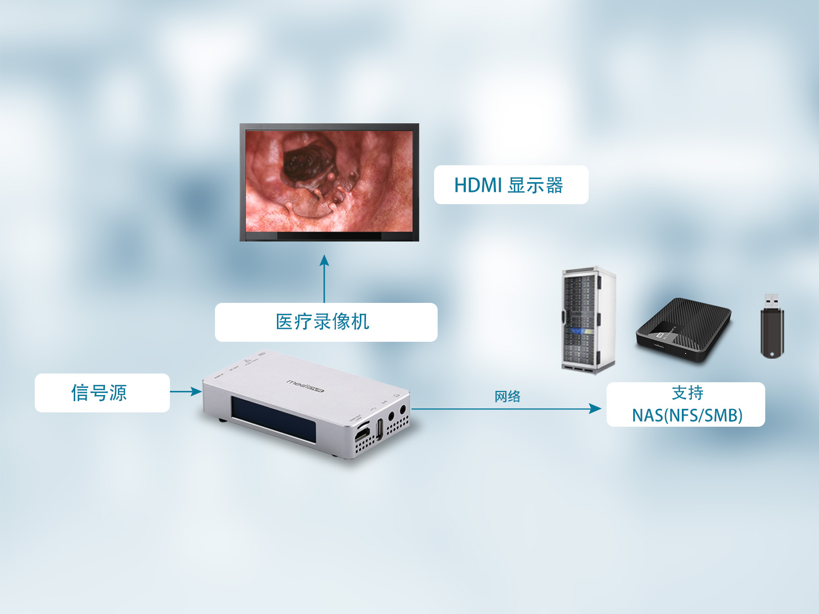 MediDVR,MD3可以無縫地從各種醫(yī)療設(shè)備(如內(nèi)窺鏡、關(guān)節(jié)鏡、手術(shù)攝像頭和超聲波機)中捕獲高清的HDMI 4K視頻。將非常清晰的靜態(tài)圖像和視頻輕松保存到外部USB硬盤驅(qū)動器、USB閃存驅(qū)動器或NAS。通過NAS, MediDVR, MD3可以將最高質(zhì)量的視頻錄像存儲數(shù)月甚至更長時間。