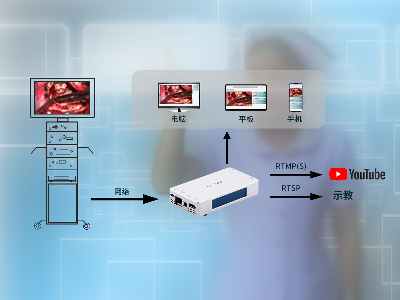 MediDVR, MD3擁有強大的直播功能。通過LAN連接這使得手術(shù)室內(nèi)的實時過程可以傳輸?shù)绞中g(shù)室外的從業(yè)者或?qū)W生,以進行培訓(xùn)或監(jiān)控,可在手機、平板、電腦上進行。