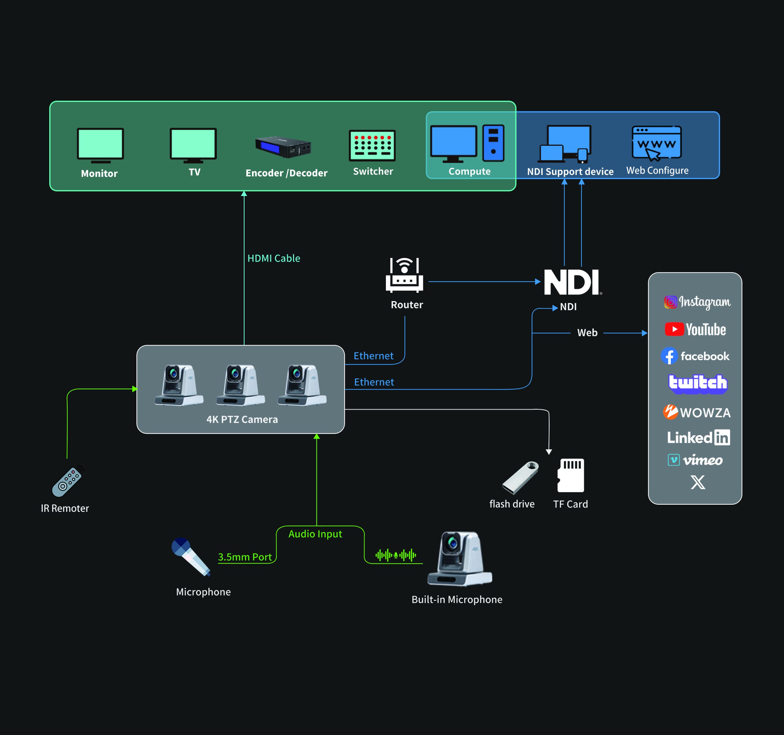 ZowiePTZ直播畫面可以作為文件記錄到 TF 卡或外部 USB 連接存儲設(shè)備或 NAS。還可以通過web端在線預(yù)覽錄制的視頻。