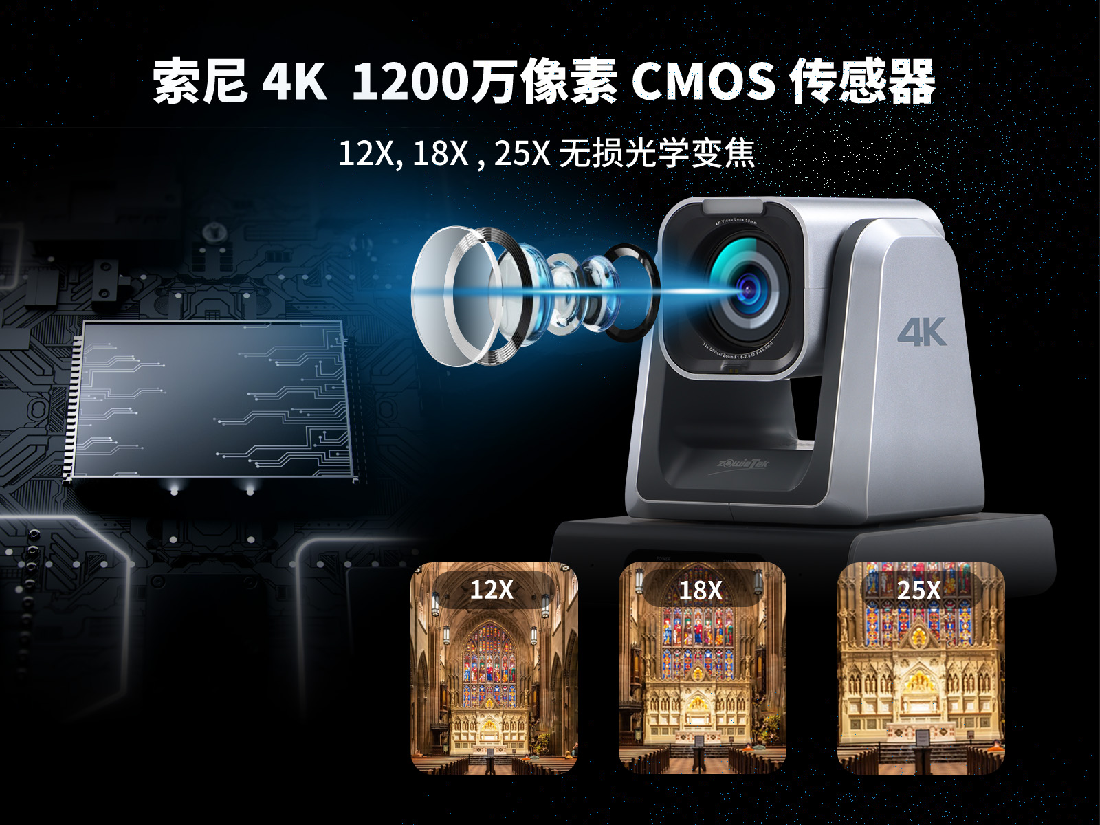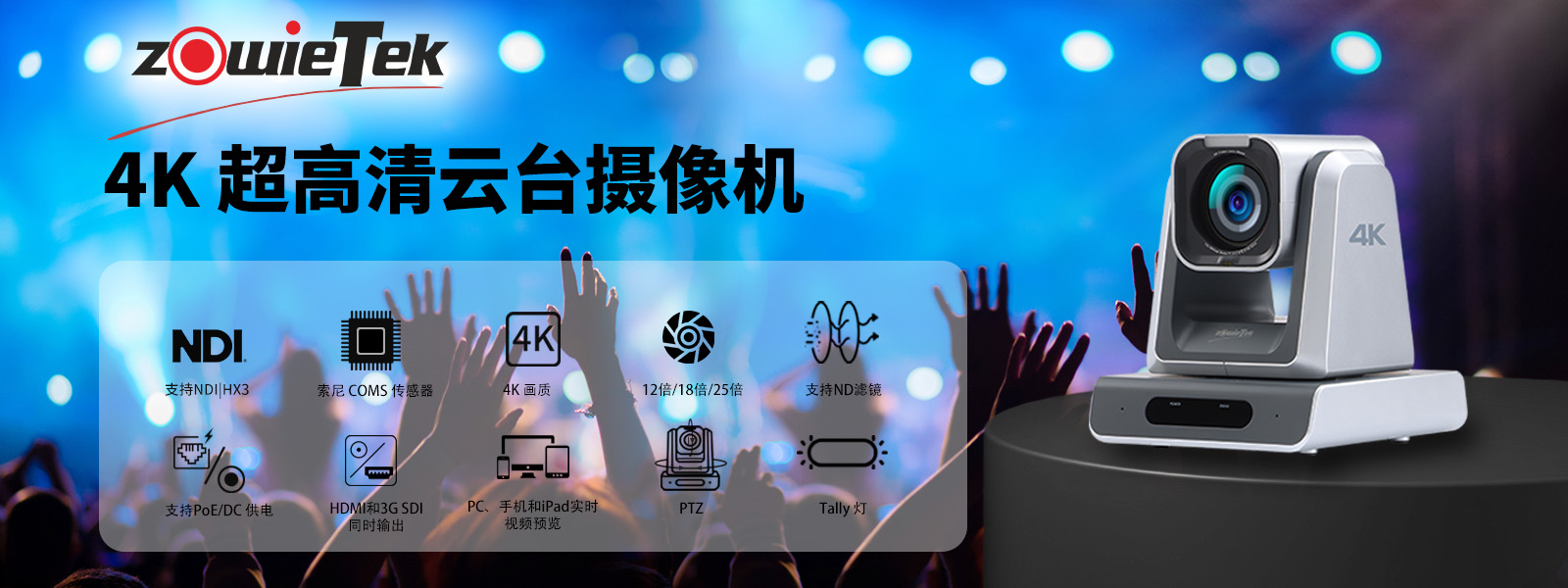 ZowiePTZ 是 Zowietek 最新的超高清云臺攝像機(jī),采用 NDI?| HX3、SDI、HDMI 適用于視頻直播制作工作流程。 ZowiePTZ 具有高達(dá) 4K 分辨率的高質(zhì)量清晰圖像,可以選擇 12 倍、18 倍、25 倍三種光學(xué)變焦鏡頭。