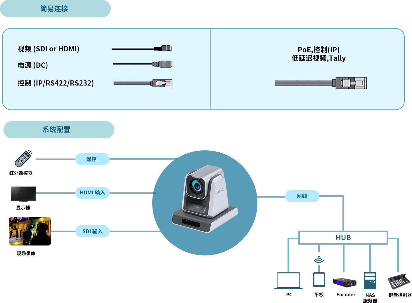 ZowiePTZ 可由以太網(wǎng)供電 (PoE+) 供電,一根網(wǎng)線即可傳輸視頻、音頻、電源和 Tally燈信號。