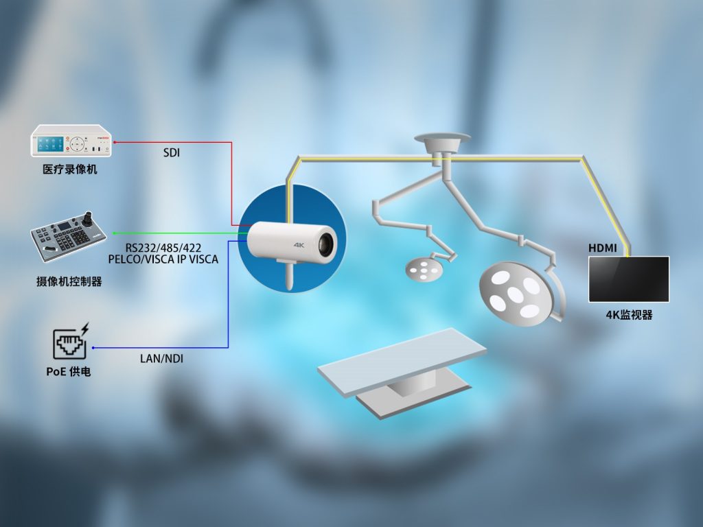 MediDVR新款術(shù)野攝像機(jī)不僅支持傳統(tǒng)的RS232/485/422 PELCO/VISCA有線控制,還支持IP VISCA和NDI的網(wǎng)絡(luò)控制。您可以使用鍵盤控制器、MediDVR的醫(yī)療錄像機(jī)或者按鍵控制。