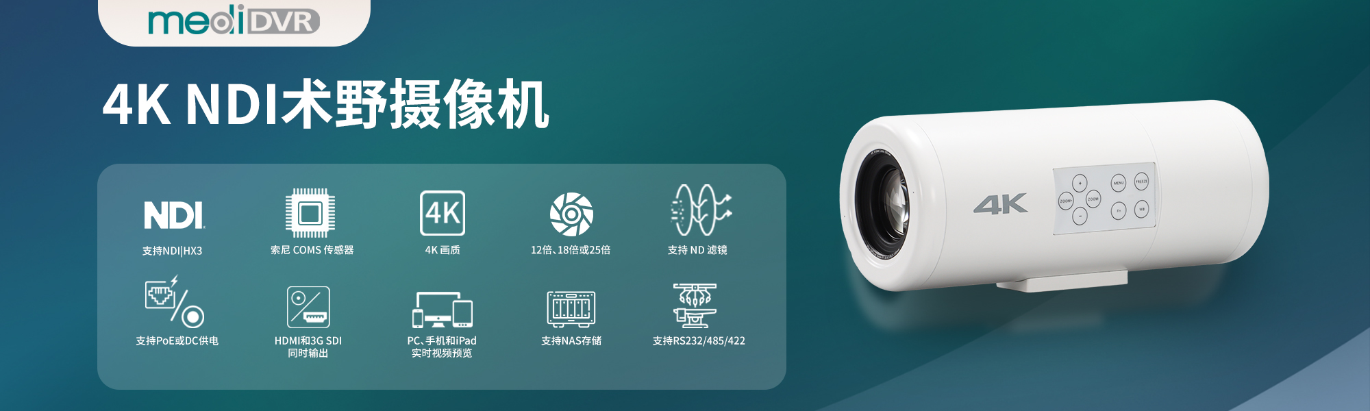 MediDVR 的新款4K 術(shù)野攝像機(jī)–MediCam,是專為捕捉手術(shù)過程中的高分辨率 4K 視頻而設(shè)計(jì)。它支持4K HDMI、3G-SDI和IP視頻同時(shí)輸出,支持PoE供電,極大地簡(jiǎn)化了安裝流程,此外它創(chuàng)新性地支持電腦、手機(jī)和iPad實(shí)時(shí)預(yù)覽和控制攝像機(jī),簡(jiǎn)便了醫(yī)生的操作。