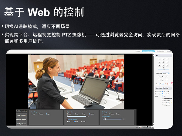 該攝像機配備頂級人形和人臉識別算法,可實現(xiàn)基于人工智能的精準自動跟蹤。它支持實時跟蹤、舞臺跟蹤和智能取景等多種模式,非常適合教室、會議、宗教場所和法庭等需要自然移動演示者或演講者的環(huán)境。