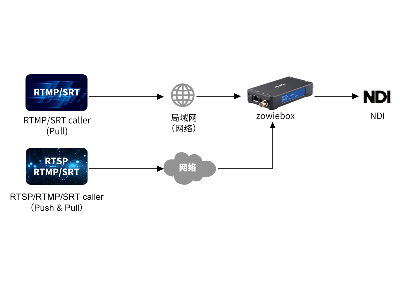 通過 ZowieBox,來自計(jì)算機(jī)、攝像機(jī)等的任何視頻信號(hào)可以遠(yuǎn)程傳輸至遠(yuǎn)端,在局域網(wǎng)中的傳輸延遲僅為 100 毫秒;通過 SRT 或 RTMP 等協(xié)議,網(wǎng)絡(luò)可以支持遠(yuǎn)距離點(diǎn)對(duì)點(diǎn)的傳輸。