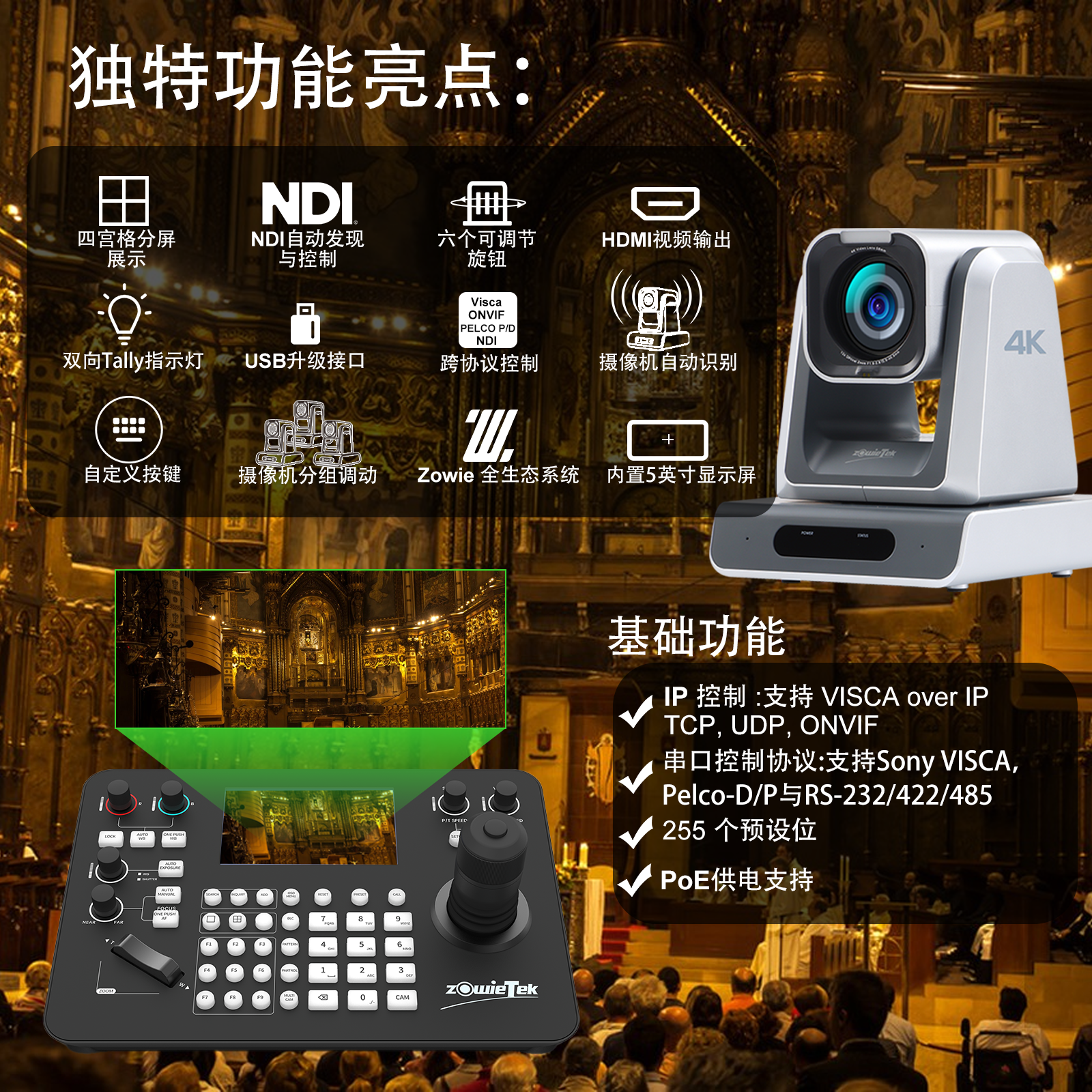 Zowie KBD 提供豐富的功能,包括 NDI 發(fā)現(xiàn)、四格網(wǎng)格查看、協(xié)議自動檢測、HDMI 輸出以及直觀的旋轉控制。它兼容 Sony VISCA、ONVIF、Pelco D/P 和 NDI 協(xié)議,支持 IP 和串行控制,并擁有多達 255 個預設位,是專業(yè)級高效攝像機操作的理想之選。