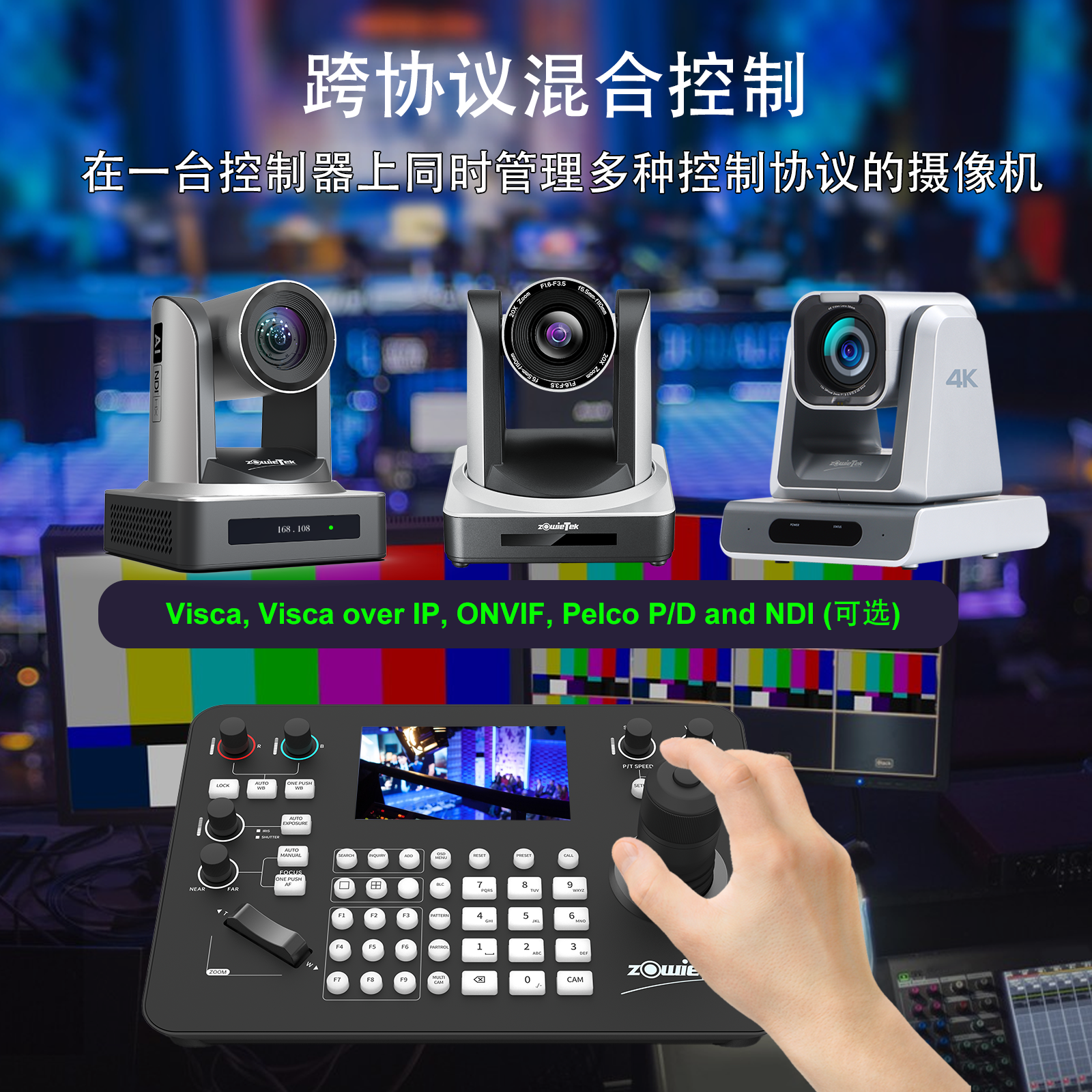 Zowie KBD可通過統(tǒng)一界面同時管理支持 VISCA、VISCA over IP、ONVIF、Pelco-D/P 以及可選 NDI 協(xié)議的攝像機。無論是網(wǎng)絡協(xié)議還是串口協(xié)議,都可兼容控制,是混合型 PTZ 應用場景的理想選擇。