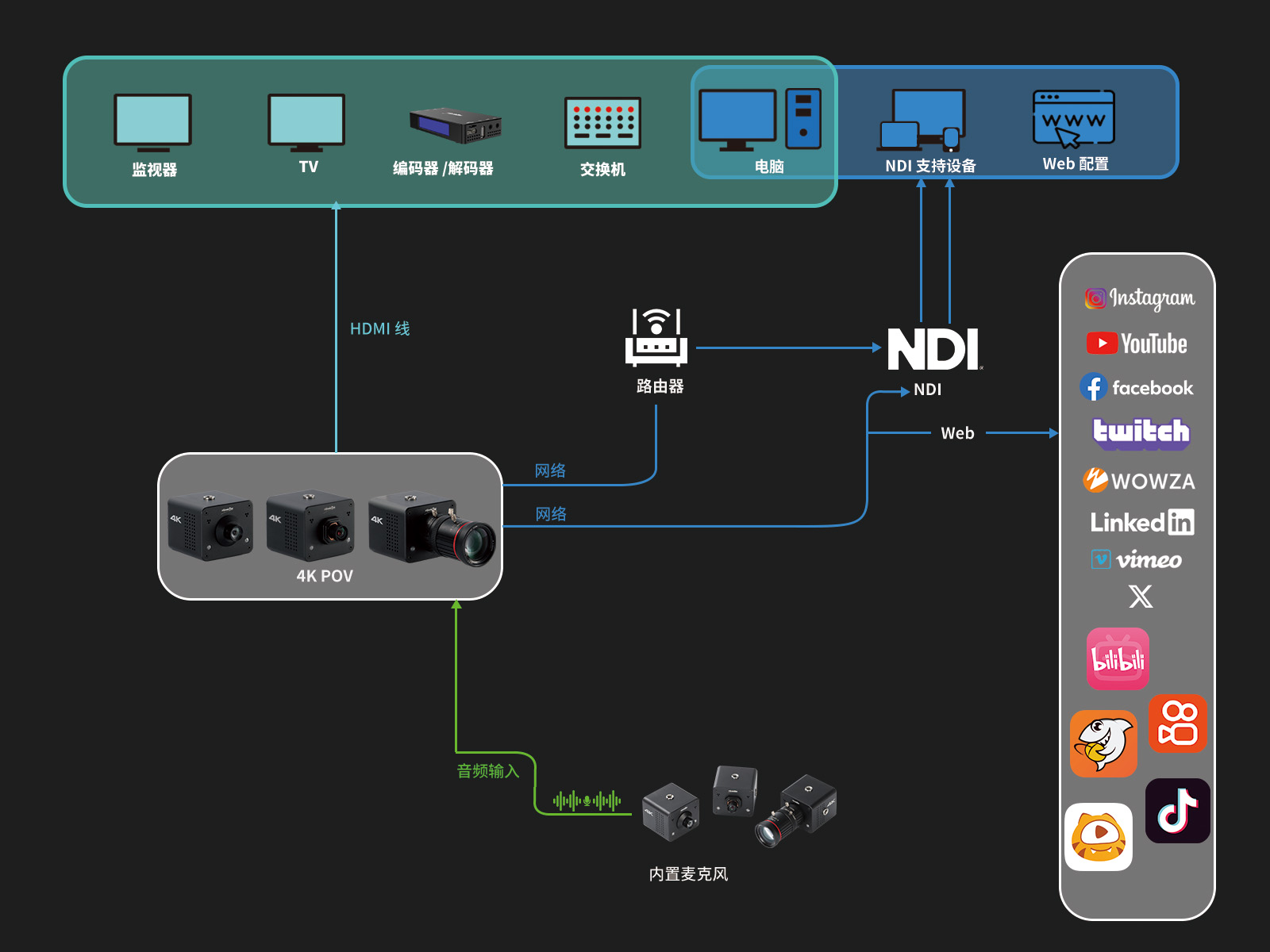 攝像機(jī)位置可以靈活布置。 它還可以通過IP網(wǎng)頁進(jìn)行控制并集成到專業(yè)視頻制作系統(tǒng)中。 此外,還提供 NDI|HX 版本,可以直接集成到您現(xiàn)有的 NDI 系統(tǒng)工作流程中。 在享受便捷遠(yuǎn)程控制的同時,您還可以流暢體驗(yàn)NDI傳輸?shù)膬?yōu)勢。