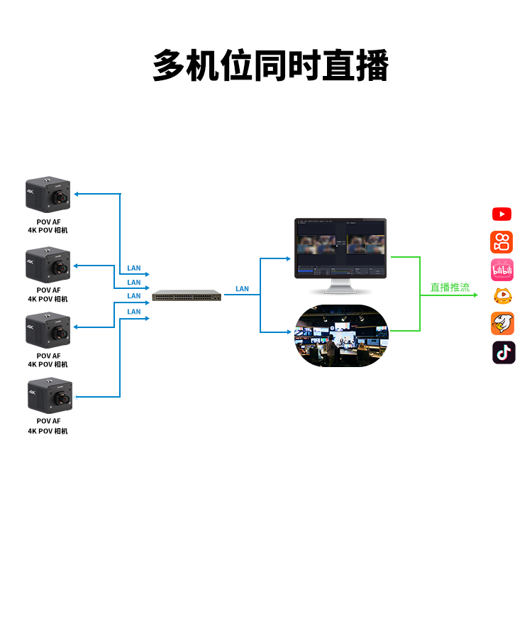 其流暢的傳輸技術(shù)可直播到所有主流RTMP(S)或SRT平臺,涵蓋了Facebook、YouTube、Twitch、LinkedIn、Instagram、Twitter、Wowza和Vimeo等,確保用戶在各大社交媒體和直播平臺上都能夠輕松展現(xiàn)出色的內(nèi)容。