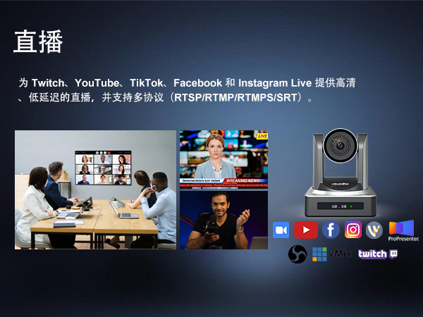 Zowietek PTZ 攝像機(jī)支持 RTSP、RTMP、RTMPS 和 SRT 協(xié)議,可直接在 YouTube、Facebook、Twitch、TikTok、Instagram 等平臺上進(jìn)行低延遲、高質(zhì)量的直播。
